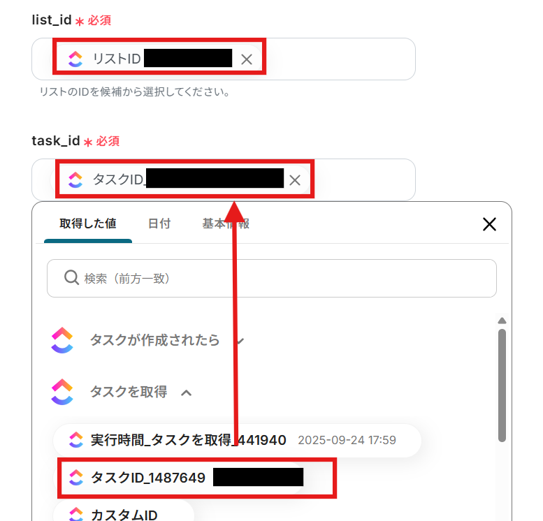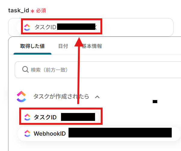 - ClickUpの「タスクを取得」や「タスクを更新」のアクションでは、操作の対象としたいタスクのIDを、固定値や前段のオペレーションで取得した値から設定できます
