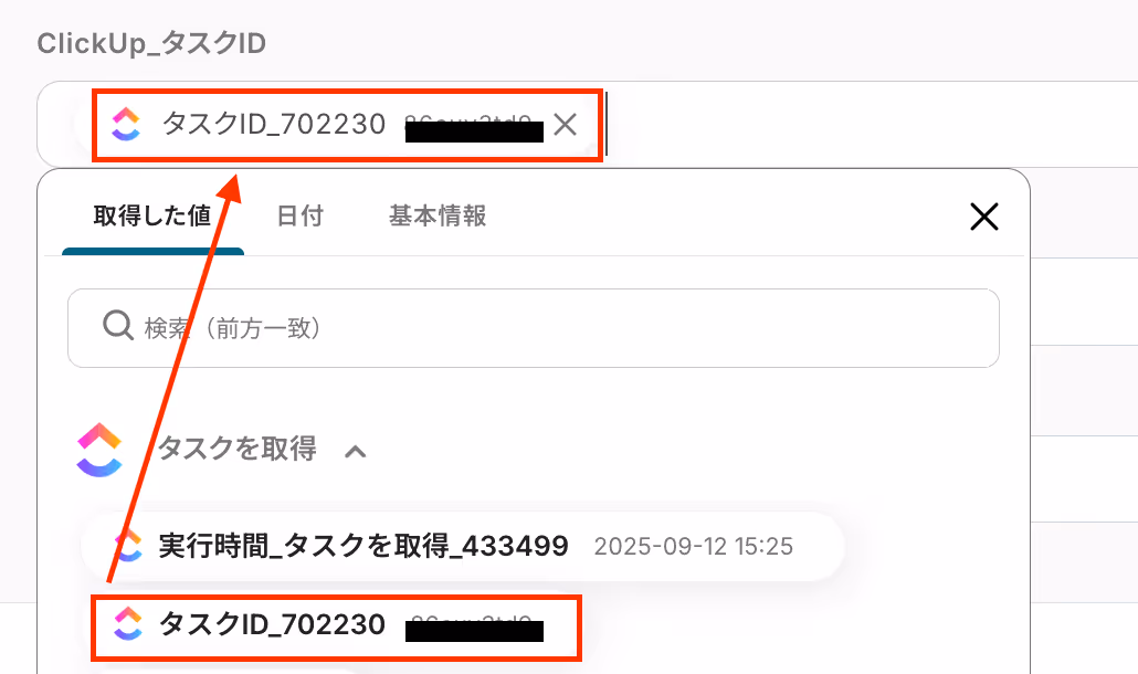 たとえば、「ClickUp_タスクID」には、「取得した値」の「タスクを取得」内にある、「タスクID」を設定します。