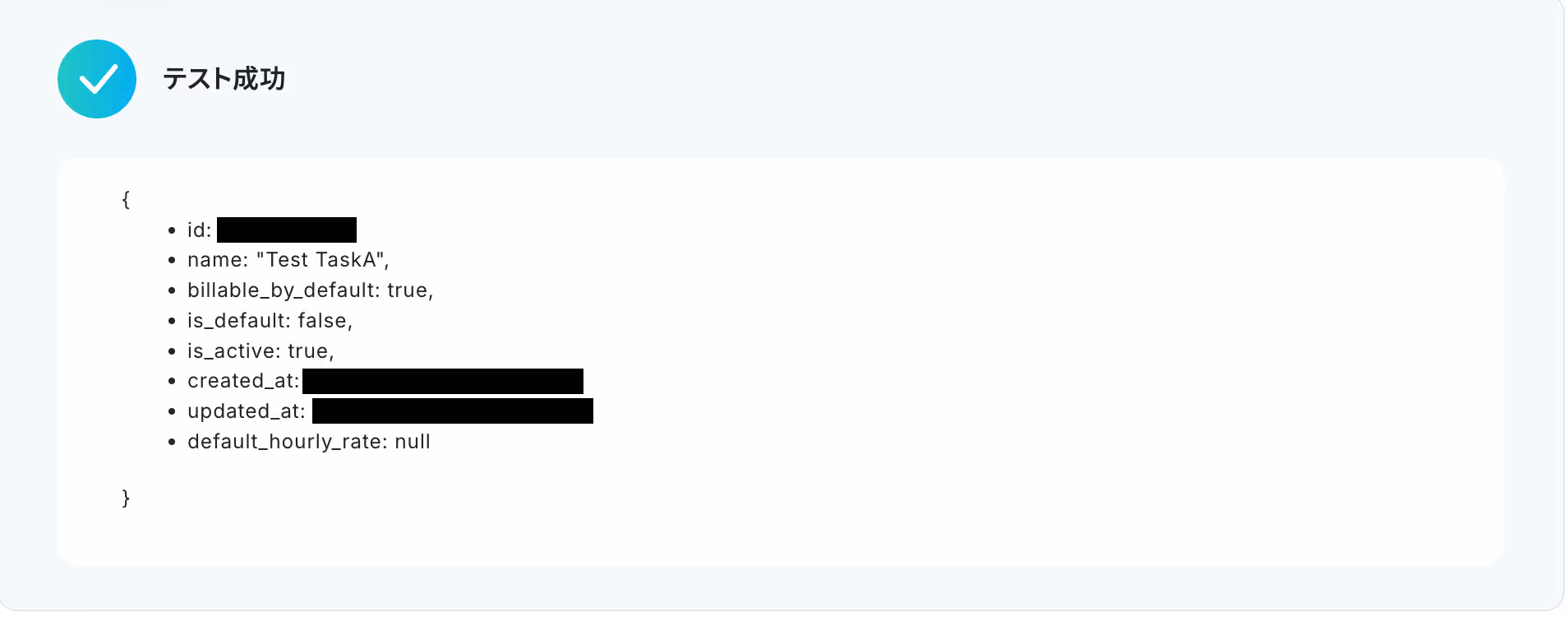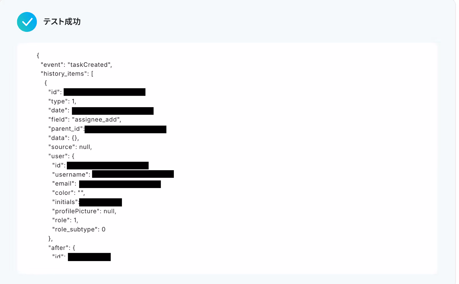 「テスト成功」と表示が出たら、取得した値にClickUpの情報が取得されます。