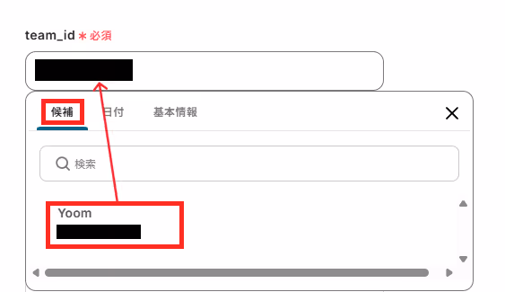 「team_id」を、入力欄をクリックして表示される候補から選択してください。