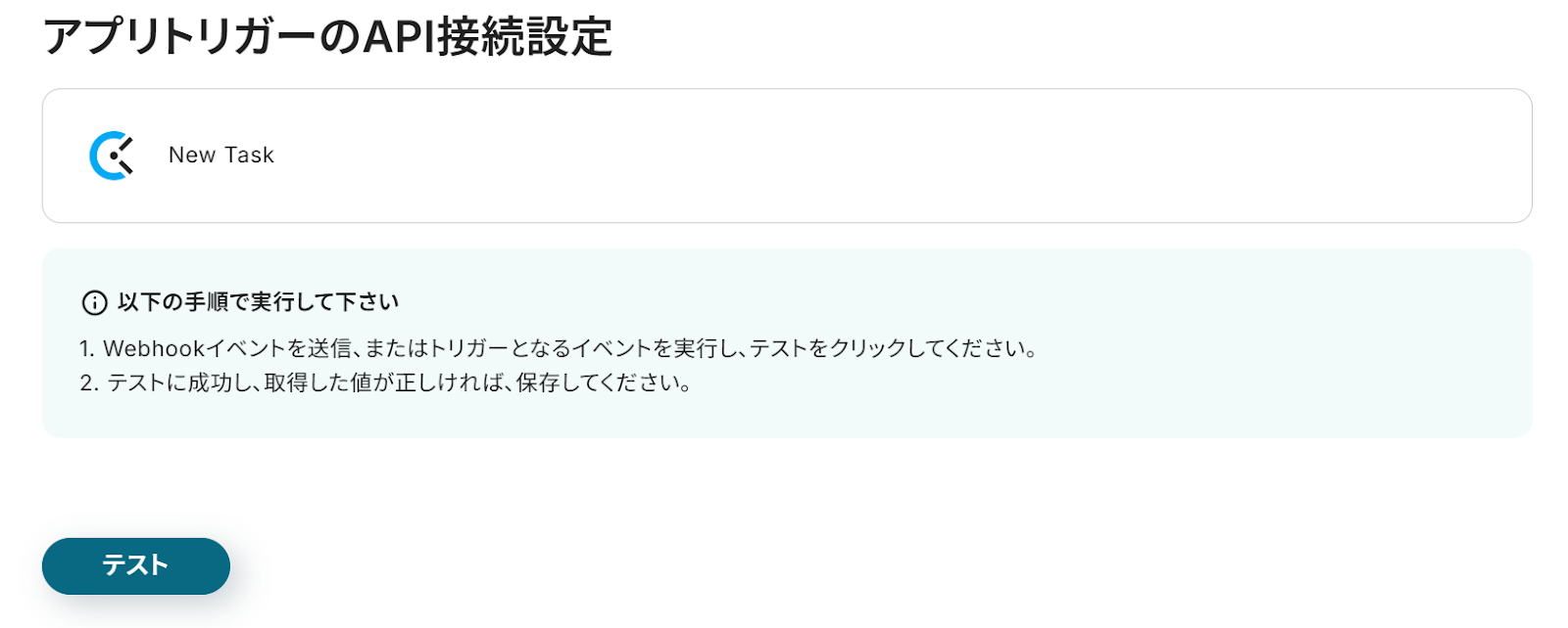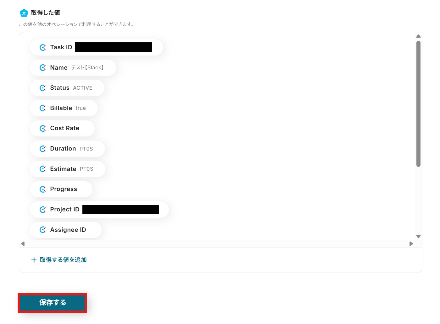 タスクの作成が終わったら、Yoomに戻ってテストをクリックしましょう。 テストが成功すると、「テスト成功」という画面が表示され、Clockifyから取得した情報をYoomで引用できるようになります。詳しくはこちら を参照してみてくださいね。 テストを終えたら、「保存する」をクリックするのを忘れないようにしましょう。
