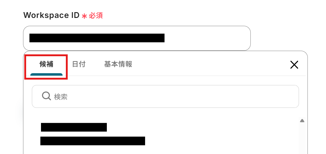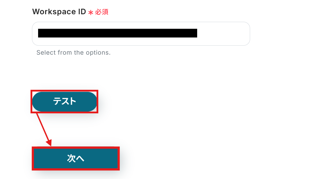 Workspace IDを設定しましょう。 入力欄をクリックすると候補が表示されるので、その中から選択します。 もし候補がうまく表示されない場合は、マイアプリ連携の設定をもう一回チェックしてみてくださいね。