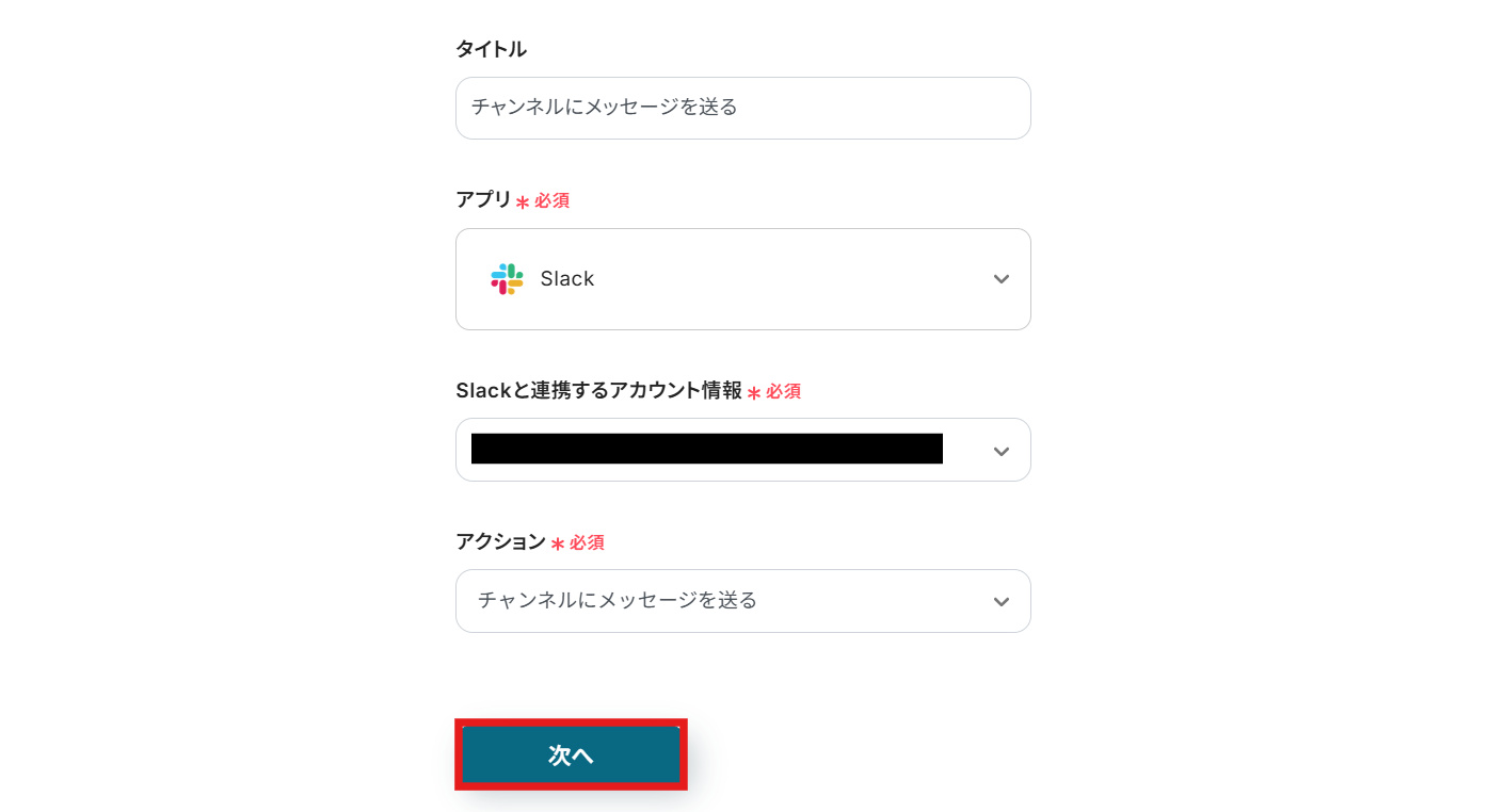 アクションに「チャンネルにメッセージを送る」を選んだら、次へ進みます。