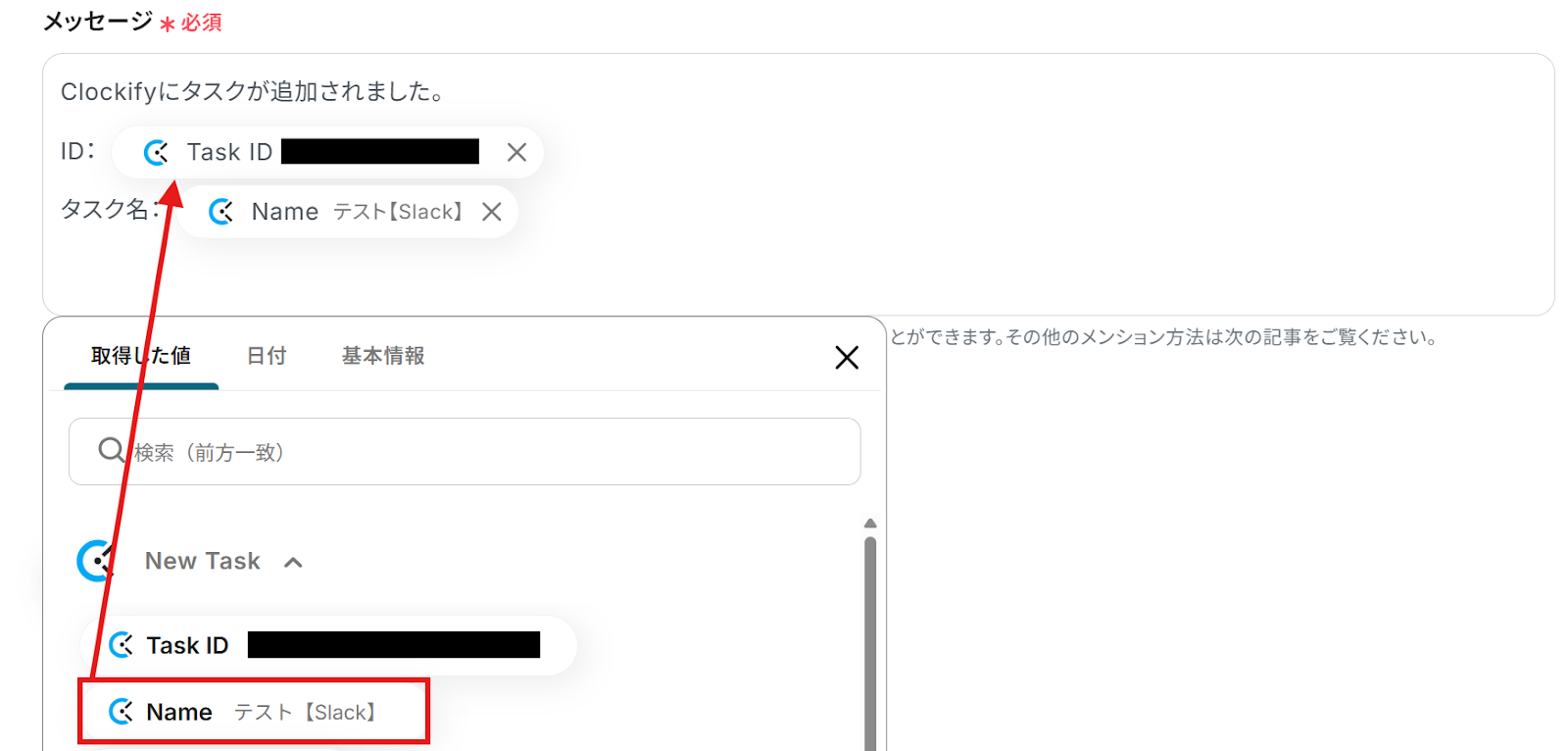 分岐機能では、通知対象としたいタスクの条件を任意で設定してください。特定のプロジェクト名や担当者が含まれる場合のみ通知するといった設定が可能です。 Slackに通知するメッセージ内容は、Clockifyで作成されたタスク名や担当者、期限などの情報を含めて自由にカスタマイズできます。 ◼️注意事項