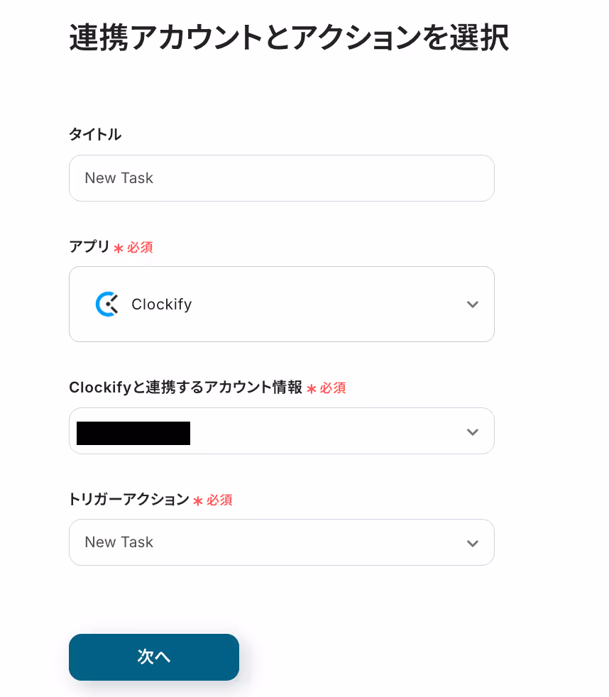 まずは、Clockifyでタスクが作成された際に、フローボットが起動するように設定を行います。