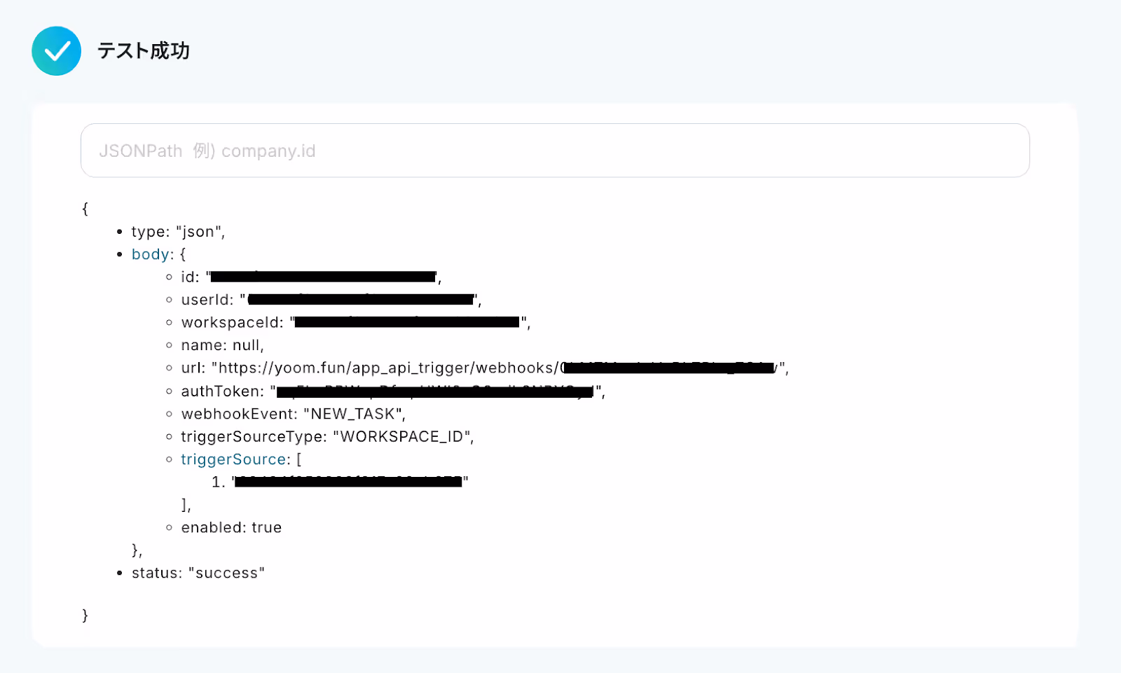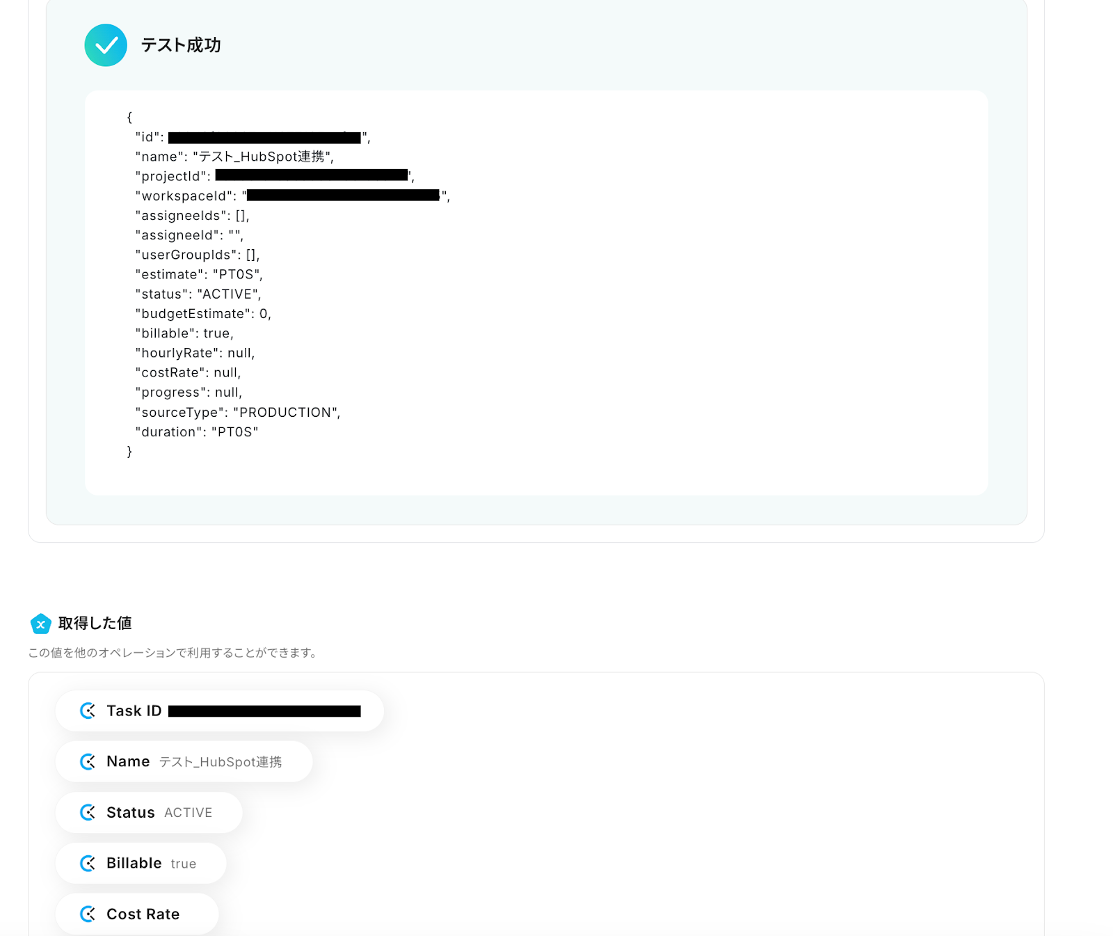テストが成功すると、先ほど作成したタスクの情報が「取得した値」にアウトプットとして抽出されるので、内容を確認しましょう。