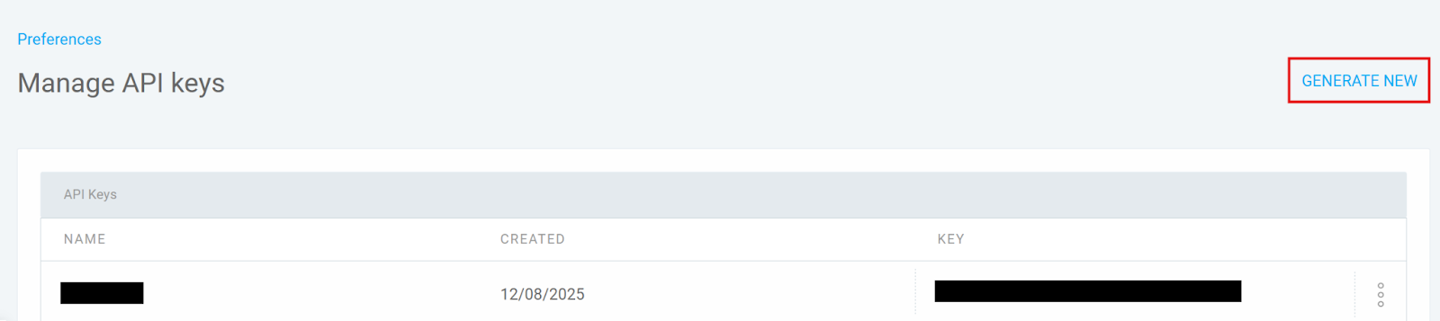 「GENERATE NEW」をクリックするとAPI Keyを作成できるので、ここで取得した値をコピーしておき、Yoomの画面に戻って「API Key」に貼り付けてくださいね!