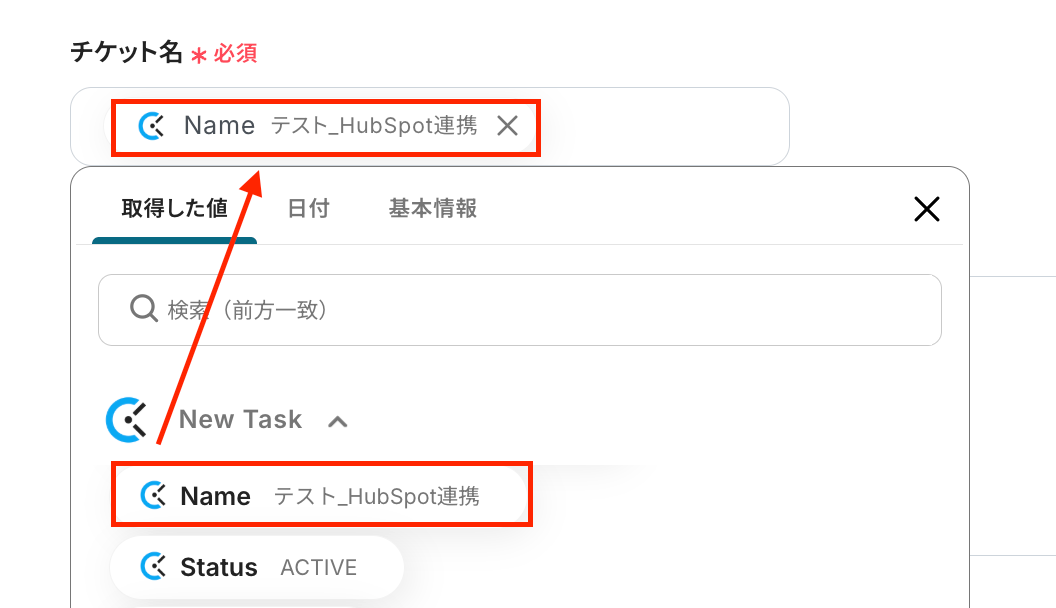 「チケット名」は、入力欄をクリックして表示される「取得した値」を使って設定しましょう。