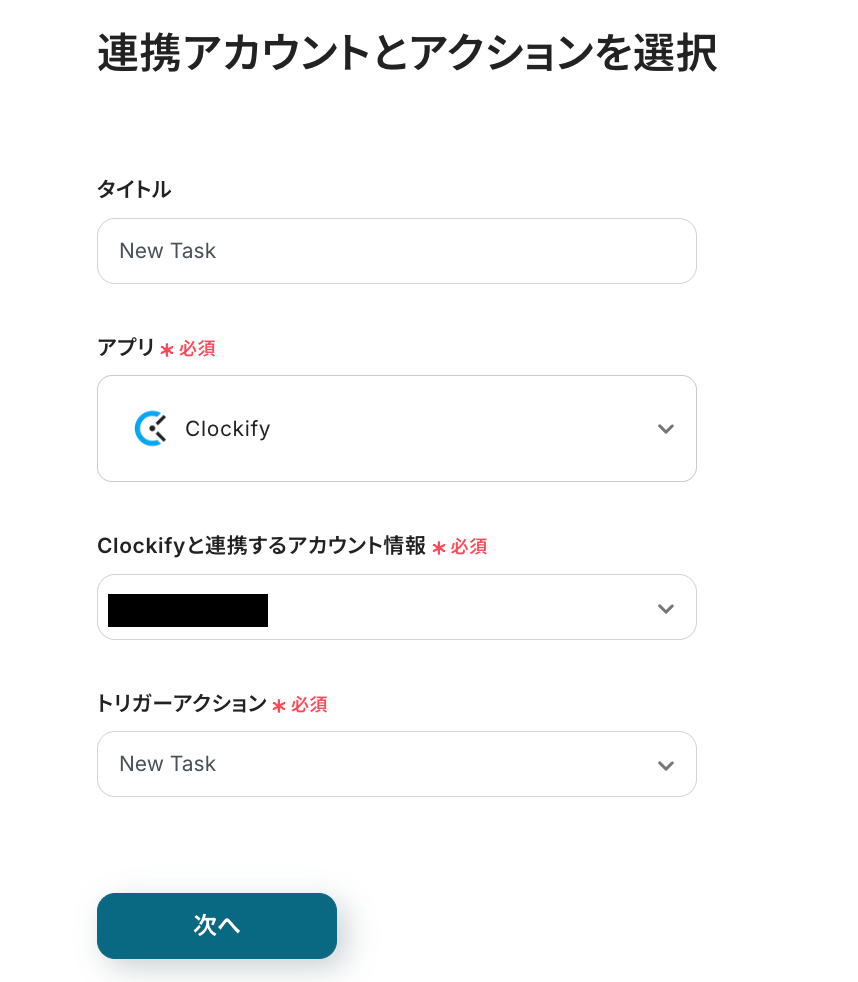 トリガーアクションは変更せず「New Task」のままにして、「次へ」を押してください。