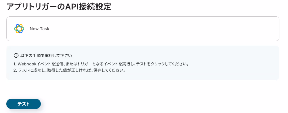次の画面では、Closeで実際にタスクを作成してから、「テスト」をクリックしましょう。