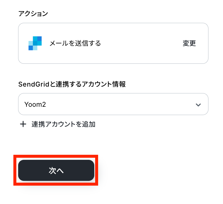 ステップ4:SendGridのアクション設定 取得した値を利用して、メールを送信する設定を行います。