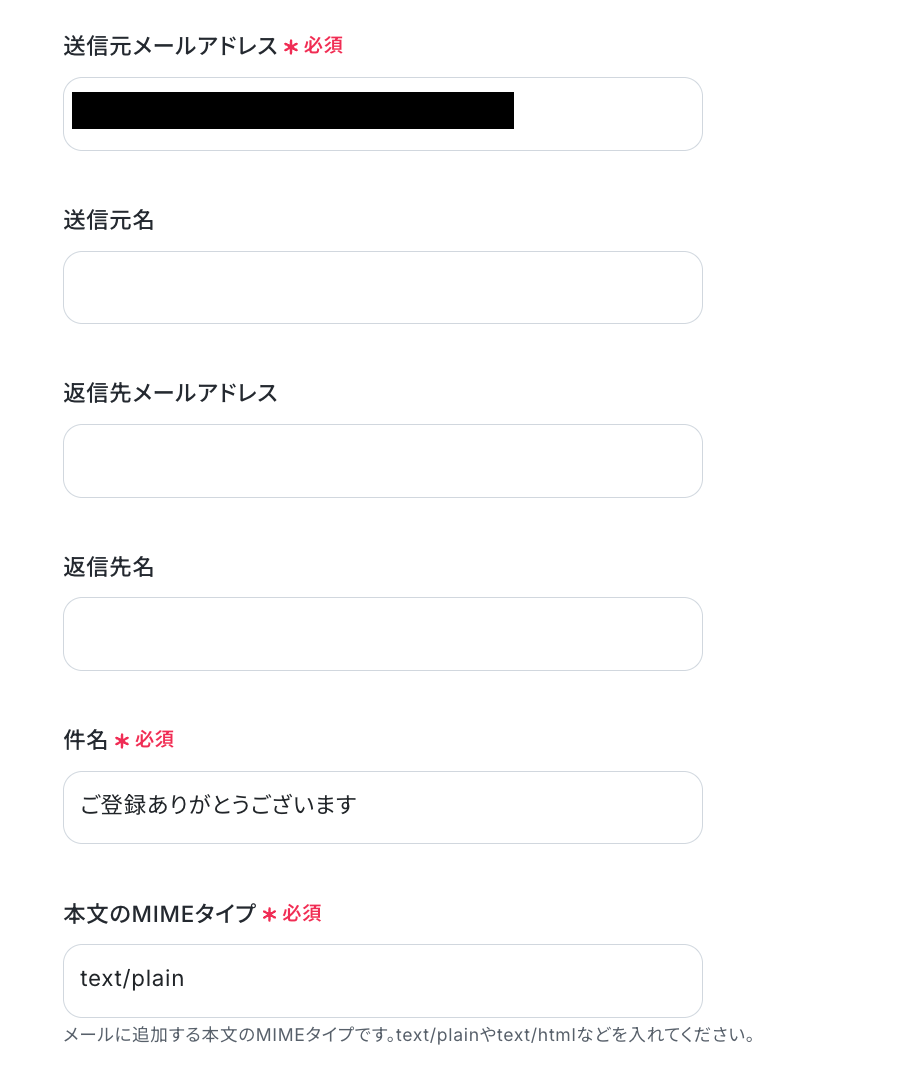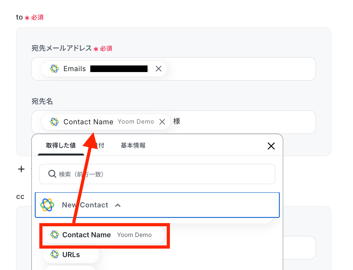 メールアドレスと宛先名を取得した値から選択して設定しましょう。