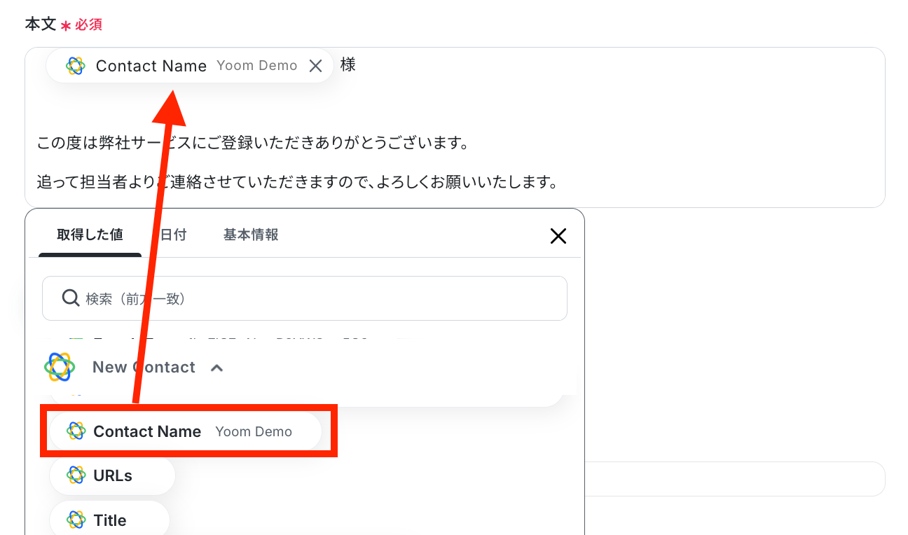SendGridの「コンタクトリストに新規コンタクトを追加」アクションを設定する際、追加先のコンタクトリストを任意で設定してください。 また、Zoho Formsから取得した氏名やメールアドレスなどの情報を、SendGridに登録するコンタクト情報の各項目に変数として設定してください。 ■注意事項