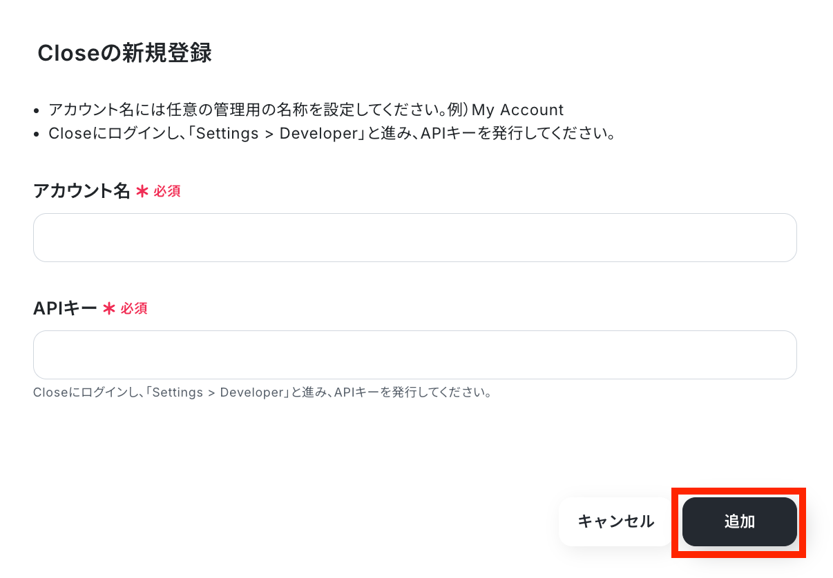 アカウント名とAPIキーを入力して、「追加」ボタンをクリックしましょう。
