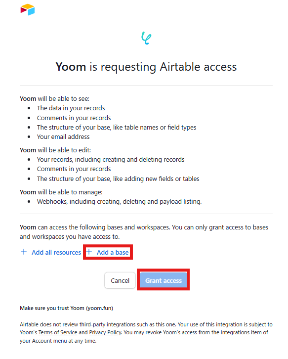 「+Add a base」からベースを追加し、「Grant access」を選択してください。