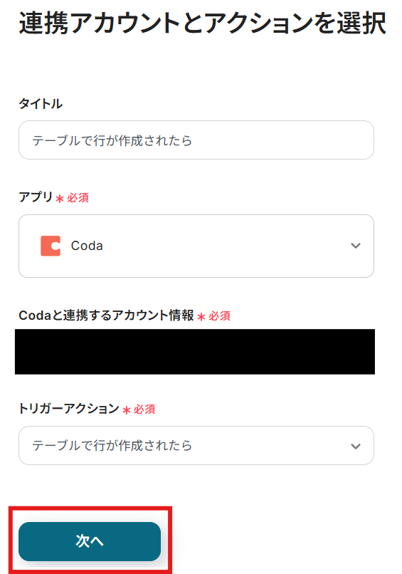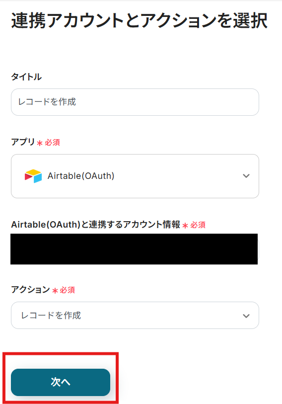 タイトルと連携するアカウント情報を確認し、アクションはテンプレート通りのまま「次へ」をクリックして進んでください。