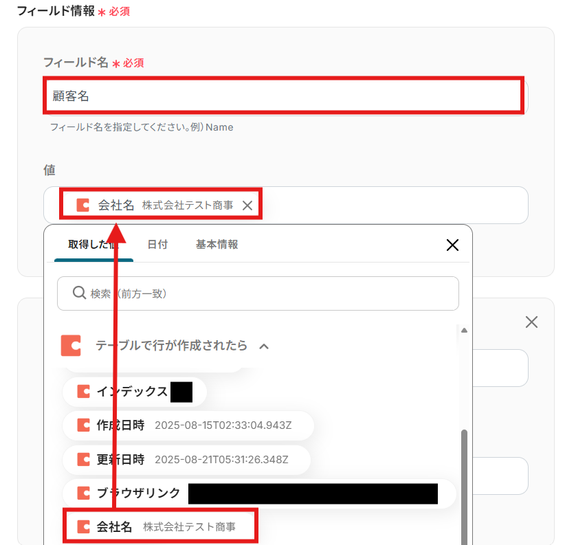 「フィールド名」にはテーブルの列の見出しを入力し、「値」を「取得した値」から設定します。