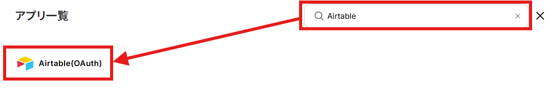 「新規接続」を選択すると「アプリ一覧」が表示されます。Airtableを検索して選択しましょう。