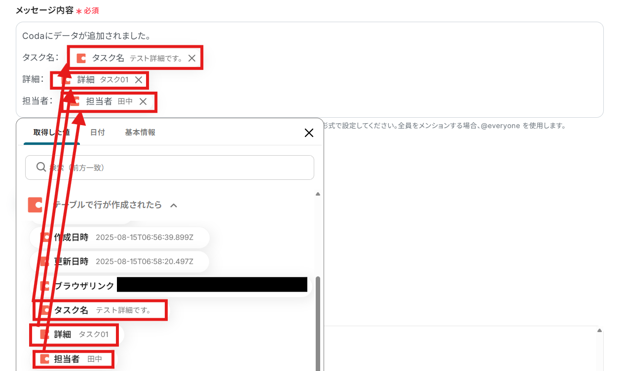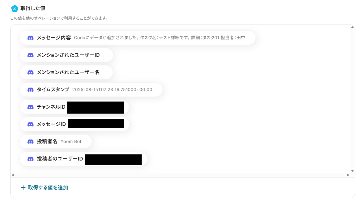 「取得した値」(アウトプット)は変数となるため、このように設定することでCodaのテーブルで行が作成される度にそのデータを活用できます。