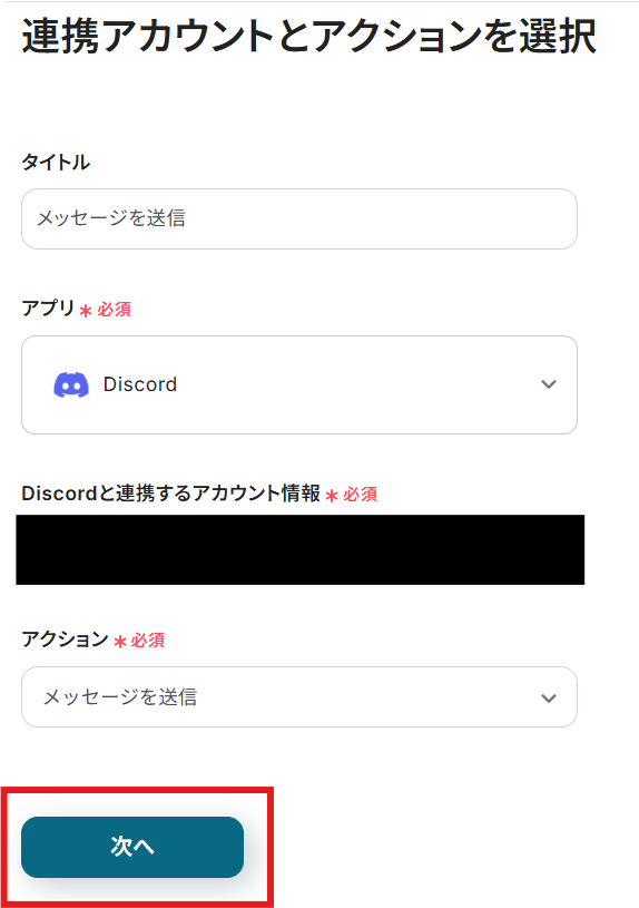 タイトルと連携するアカウント情報を確認し、アクションはテンプレート通りのまま「次へ」をクリックして進んでください。