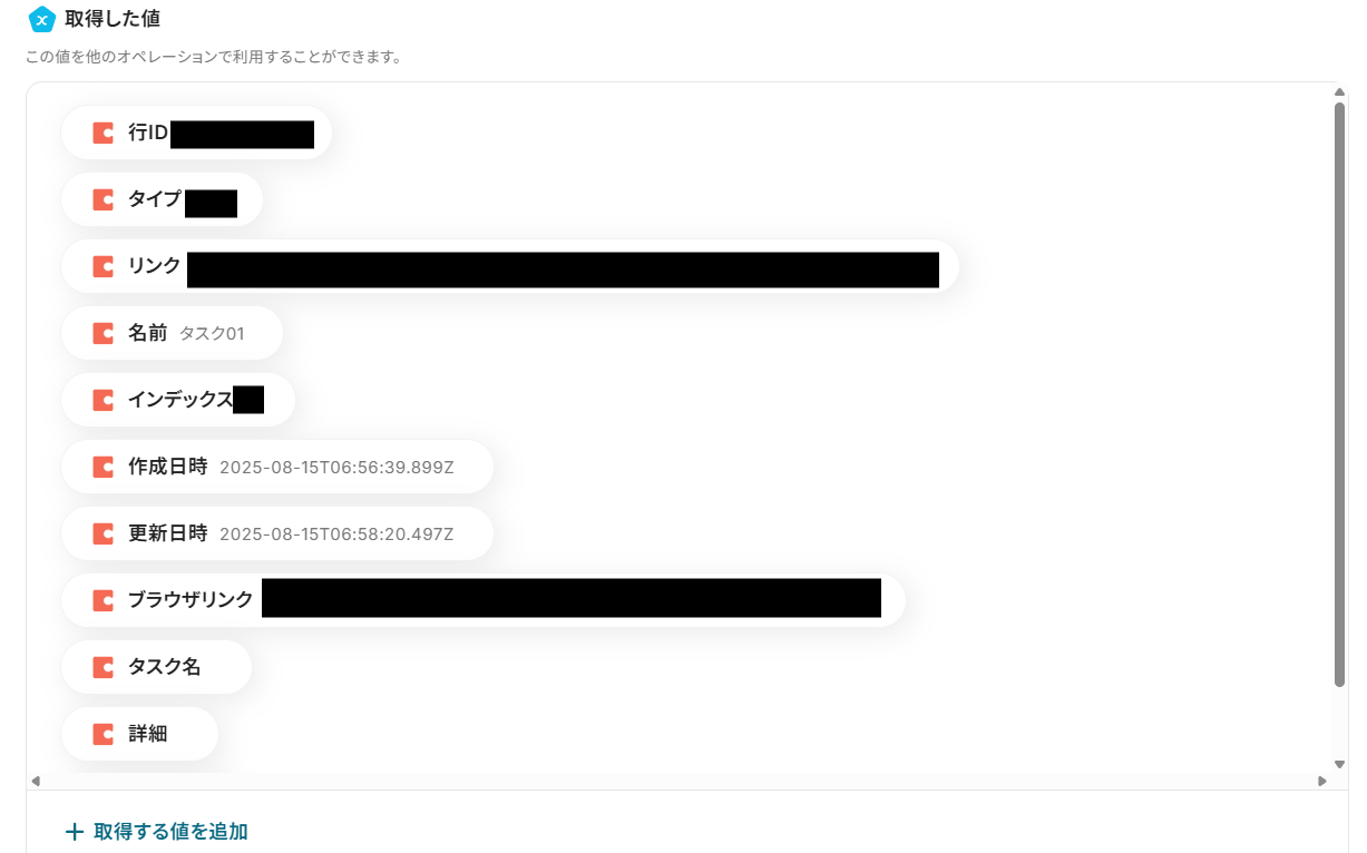 手動で「取得した値」(アウトプット)を追加する方法について、詳しくはこちらをご覧ください。