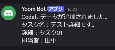 Codaに新しいタスクや議事録、顧客情報などの行が追加された際に、その内容を自動でDiscordの特定チャンネルに通知する連携です。