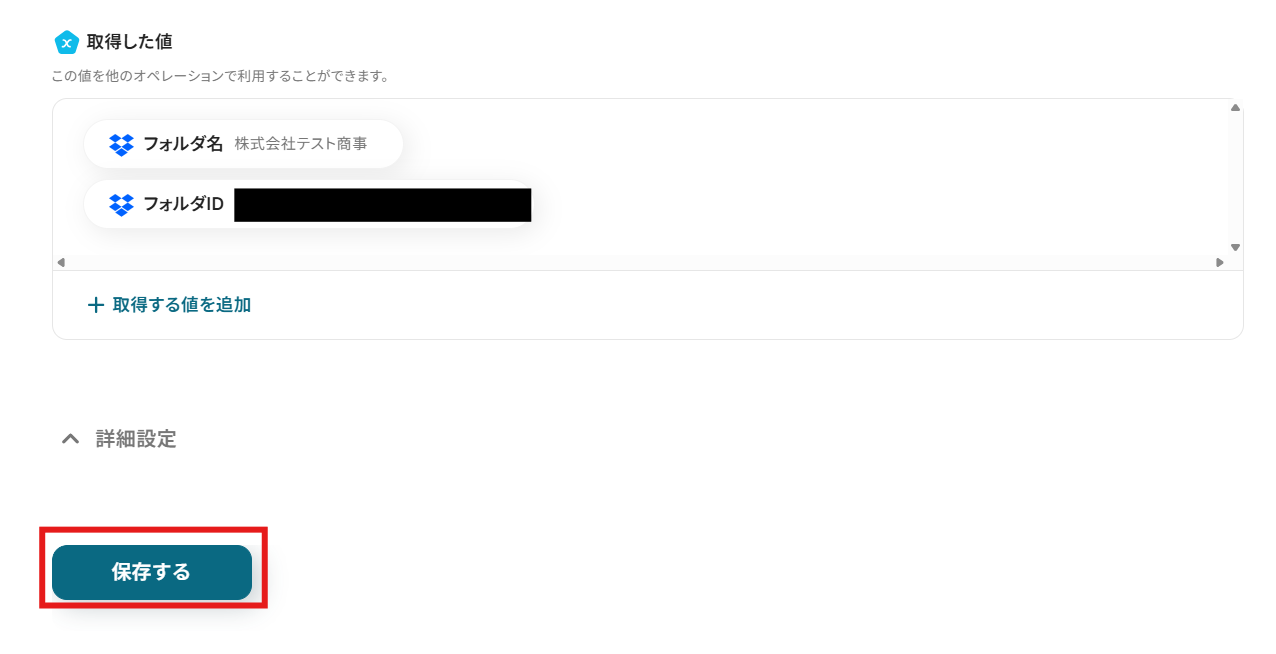 また、「取得した値」(アウトプット)にDropboxの情報が反映されるので、確認したら「保存する」を選択しましょう。