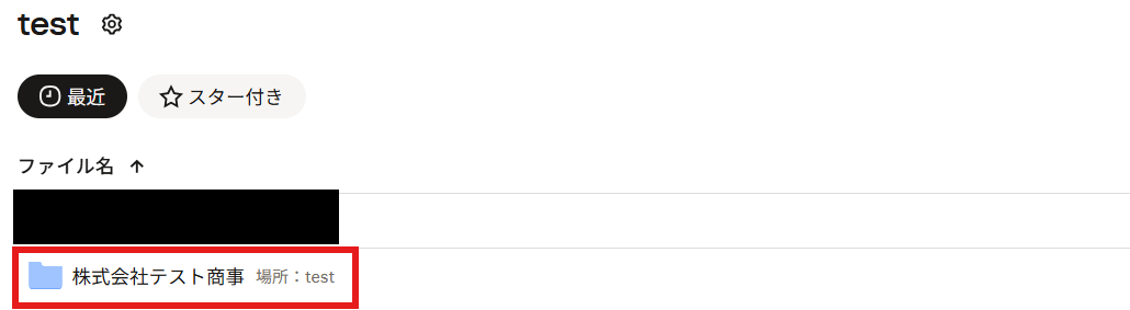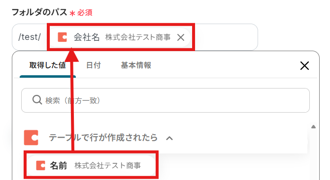 今回の例でいえば、「フォルダのパス」に「test/{{会社名}}/{{姓}}」と設定すれば、testフォルダ>株式会社テスト商事フォルダ>田中フォルダといった階層でフォルダを作成できます。