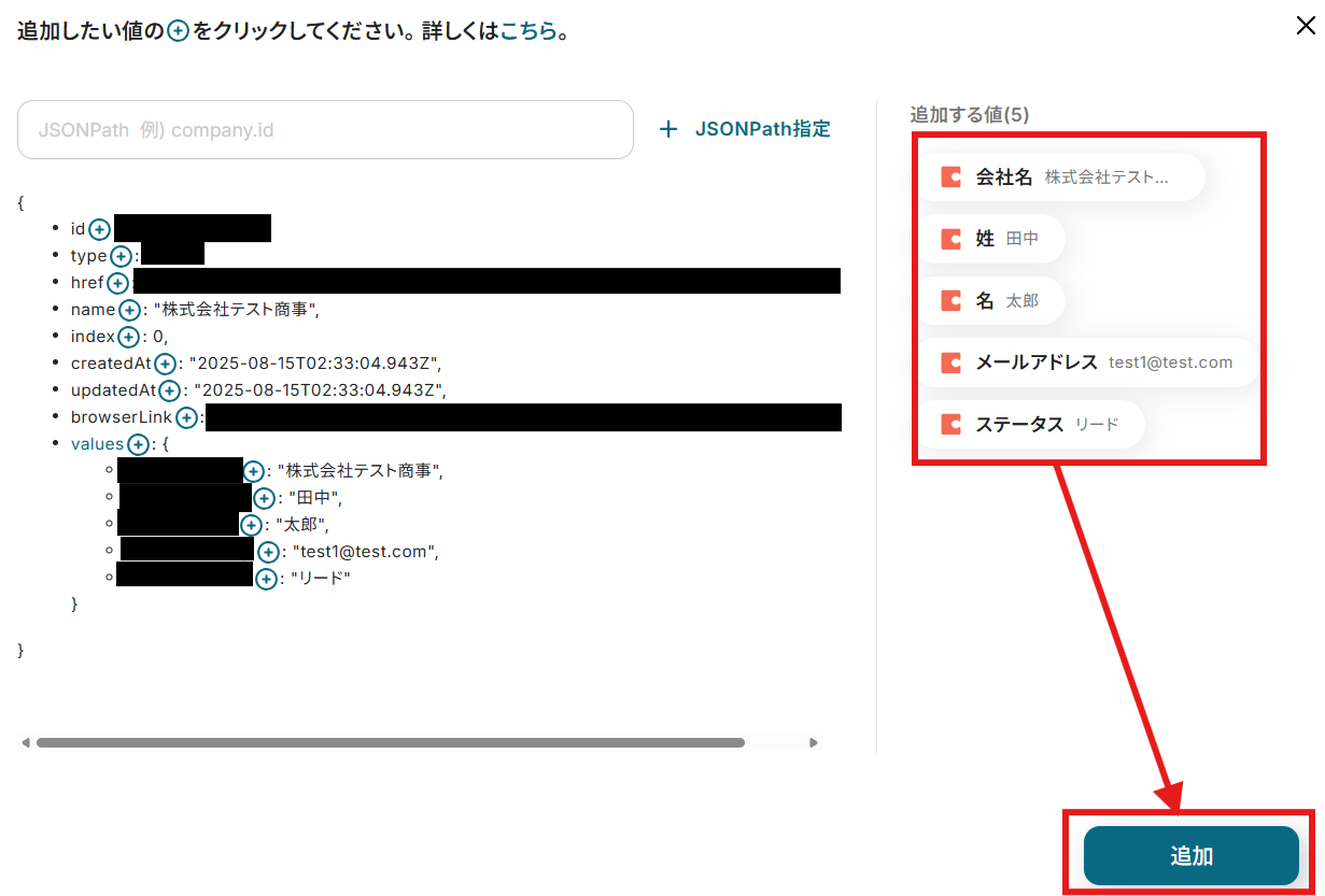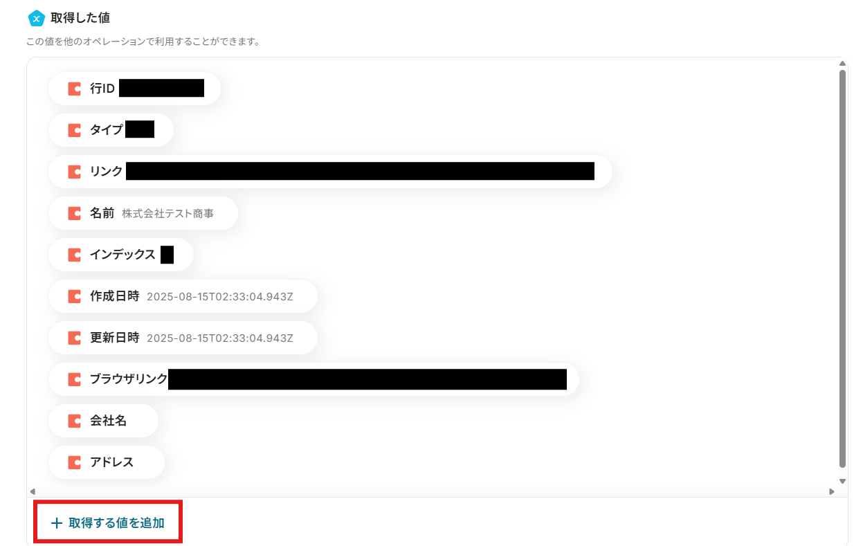 すべての情報が「取得した値」に反映されているわけではないので、連携したい項目を手動で取得する必要があります。