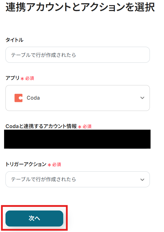 タイトルと連携するアカウント情報を確認し、アクションはテンプレート通りのまま「次へ」をクリックして進んでください。