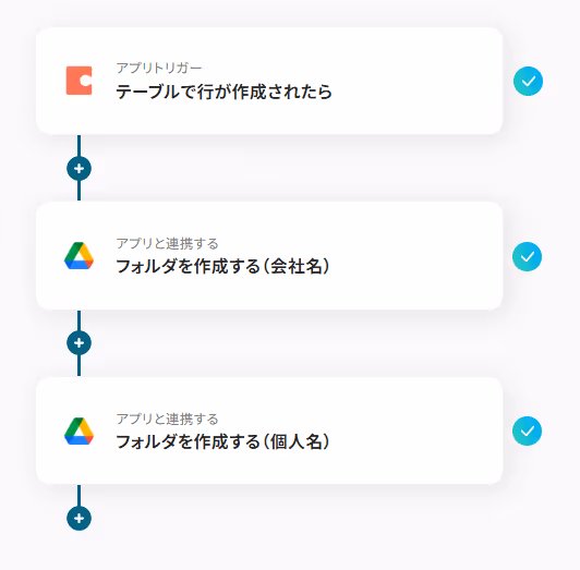 設定する際は、Google Driveの「フォルダを作成する」オペレーションを「+」マークから追加してください。