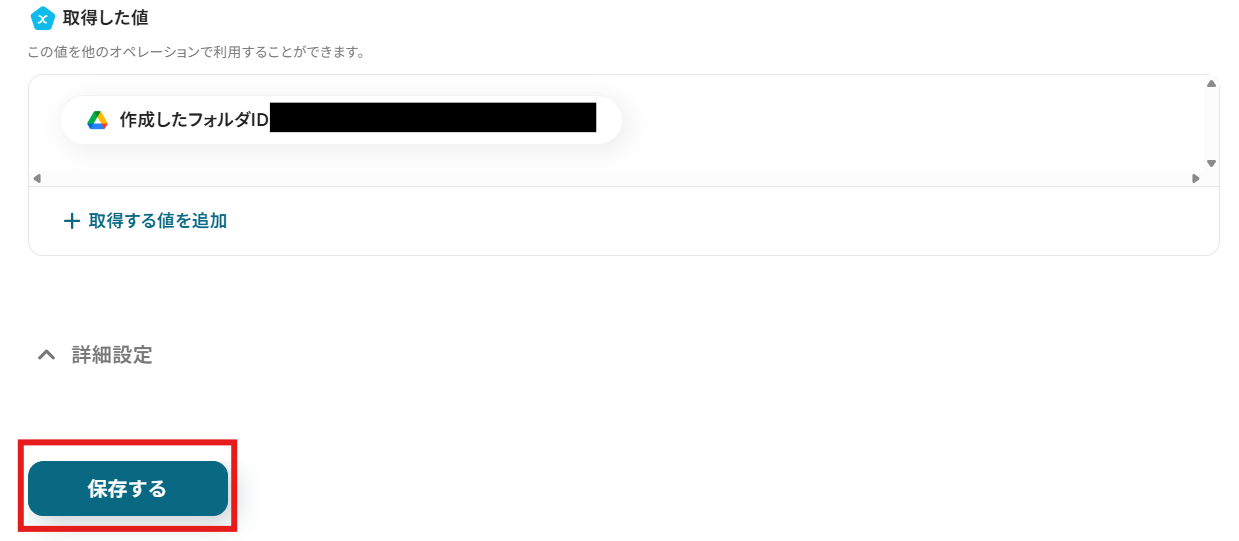設定できたら「テスト」を行います。 成功すると、Google Driveにフォルダが作成されるので確認してください。 また、「取得した値」(アウトプット)にGoogle Driveの情報が反映されるので、確認したら「保存する」を選択しましょう。