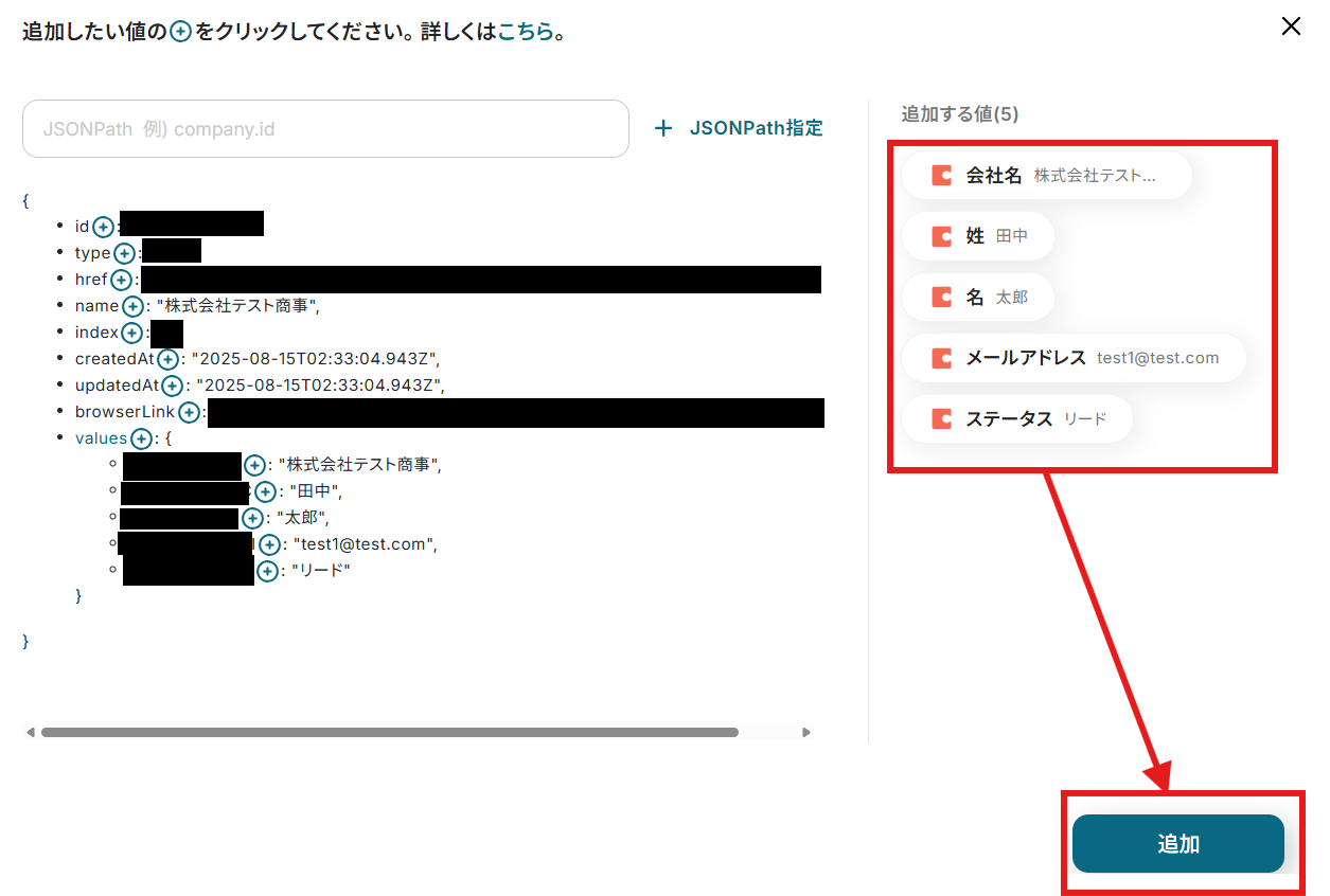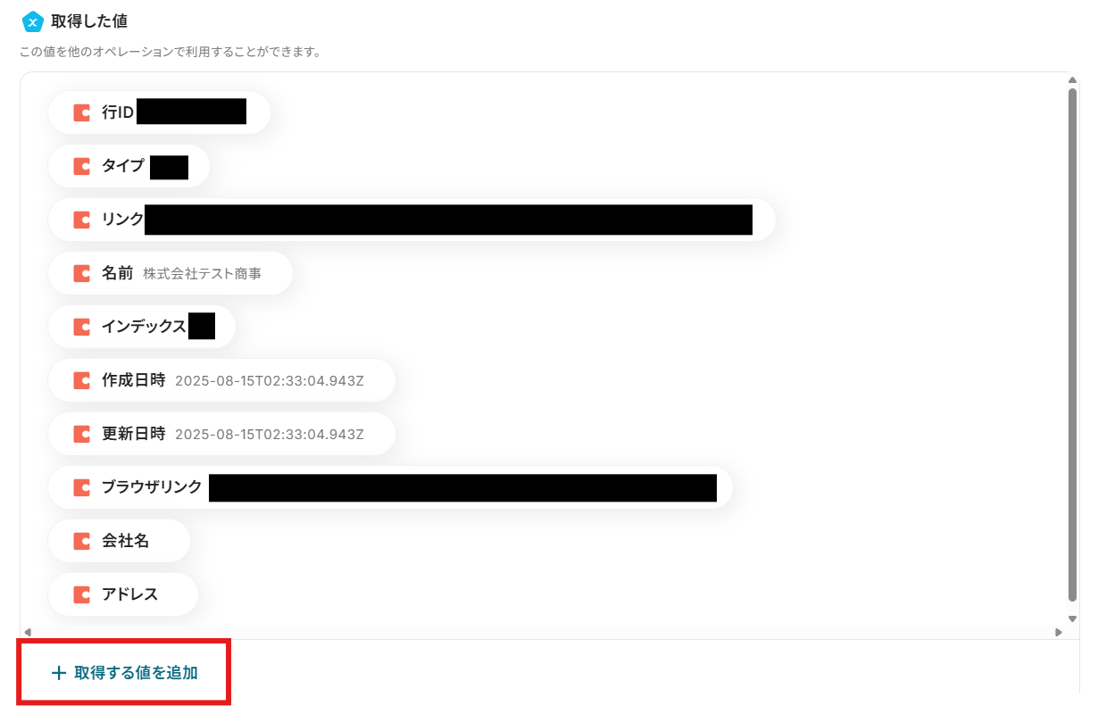 テストに成功すると「取得した値」(アウトプット)に反映されます。 「取得した値」(アウトプット)について、詳しくはこちら をご覧ください。 しかし、すべてが「取得した値」に反映されているわけではないので、必要な項目を手動で取得する必要があります。 「+取得する値を追加」から追加していきましょう。