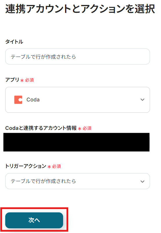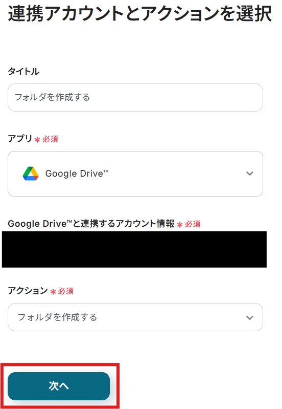 タイトルと連携するアカウント情報を確認し、アクションはテンプレート通りのまま「次へ」をクリックして進んでください。