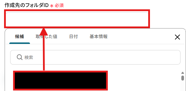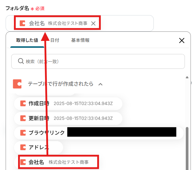 今回は「取得した値」の「会社名」をフォルダ名に設定しました! 「取得した値」(アウトプット)は変数となるため、Codaのテーブルで行が作成される度にそのデータを活用できます! もし固定値を設定したい場合は、直接入力してください。 取得した値と固定値を組み合わせてフォルダ名を設定することもできます。