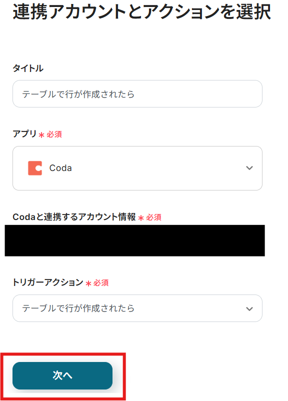 タイトルと連携するアカウント情報を確認し、トリガーアクションはテンプレート通りのまま「次へ」をクリックして進んでください。