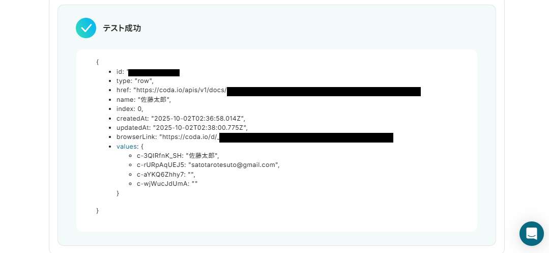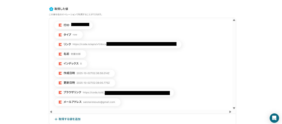テストが成功すると、Codaのデータが取得した値に表示されるので、誤りが無いか確認し「保存する」ボタンをクリックしましょう。