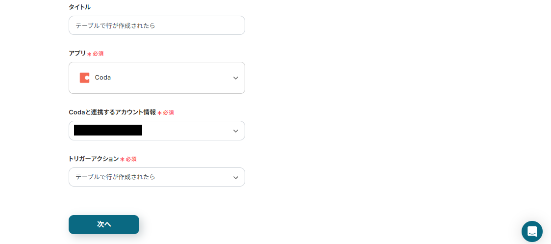 タイトルを任意で設定し、Trelloと連携しているアカウントやアクション内容を確認したら「次へ」をクリックしてください。