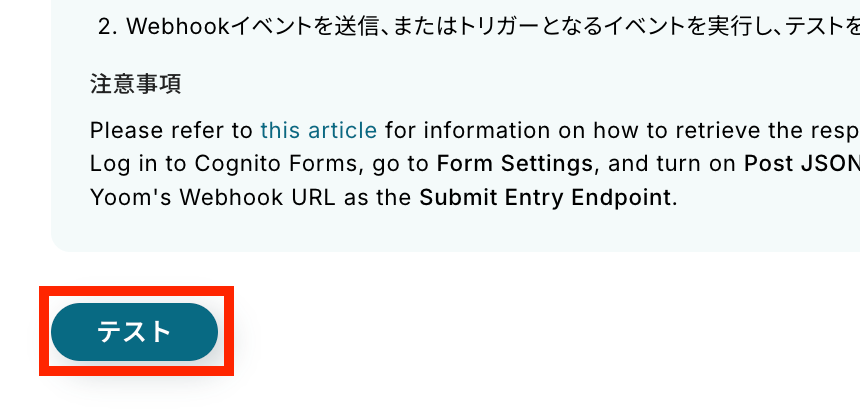 赤枠をクリックしてURLをコピーしたら、注意事項にしたがってCognito Forms上でWebhookを登録します。