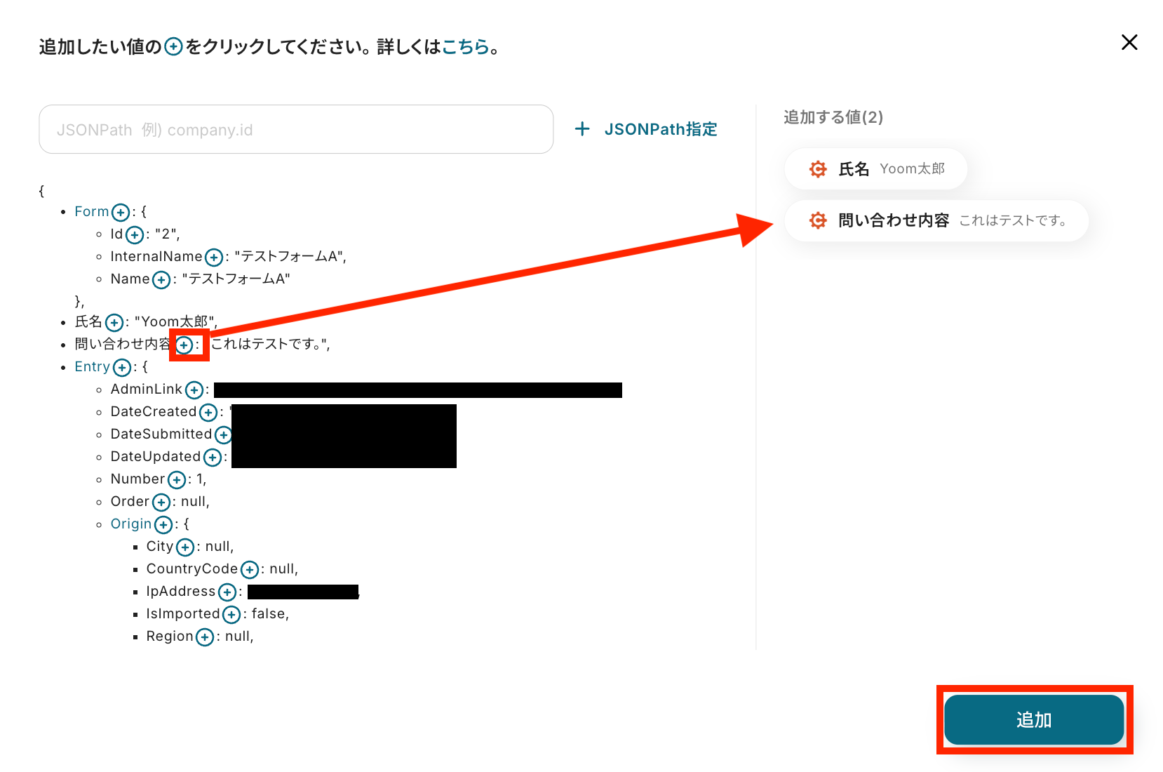 追加したい項目の右にあるプラスマークをクリックして追加する値を選択し、「追加」ボタンを押します。