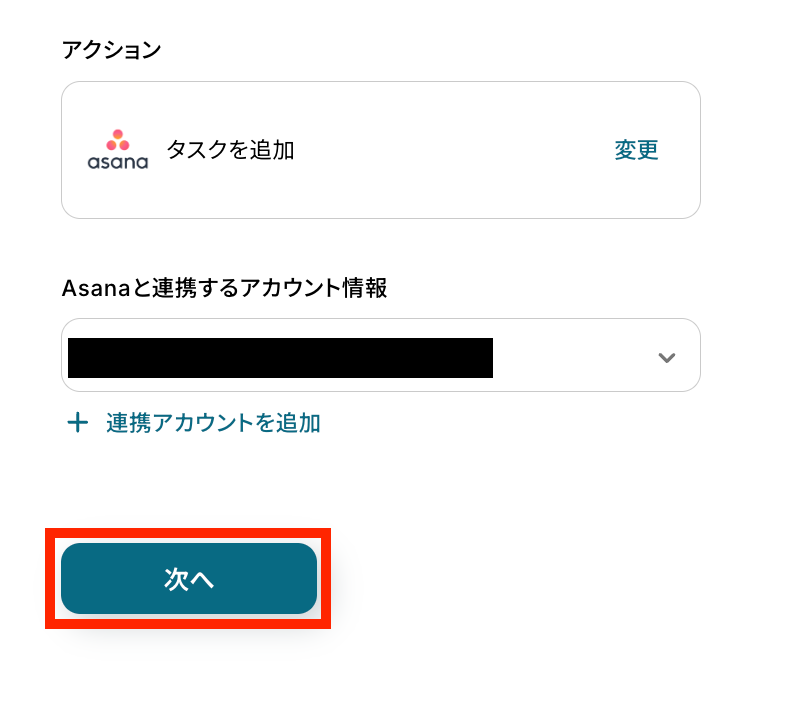 アクションは「タスクを追加」のままで、アカウント情報を確かめます。