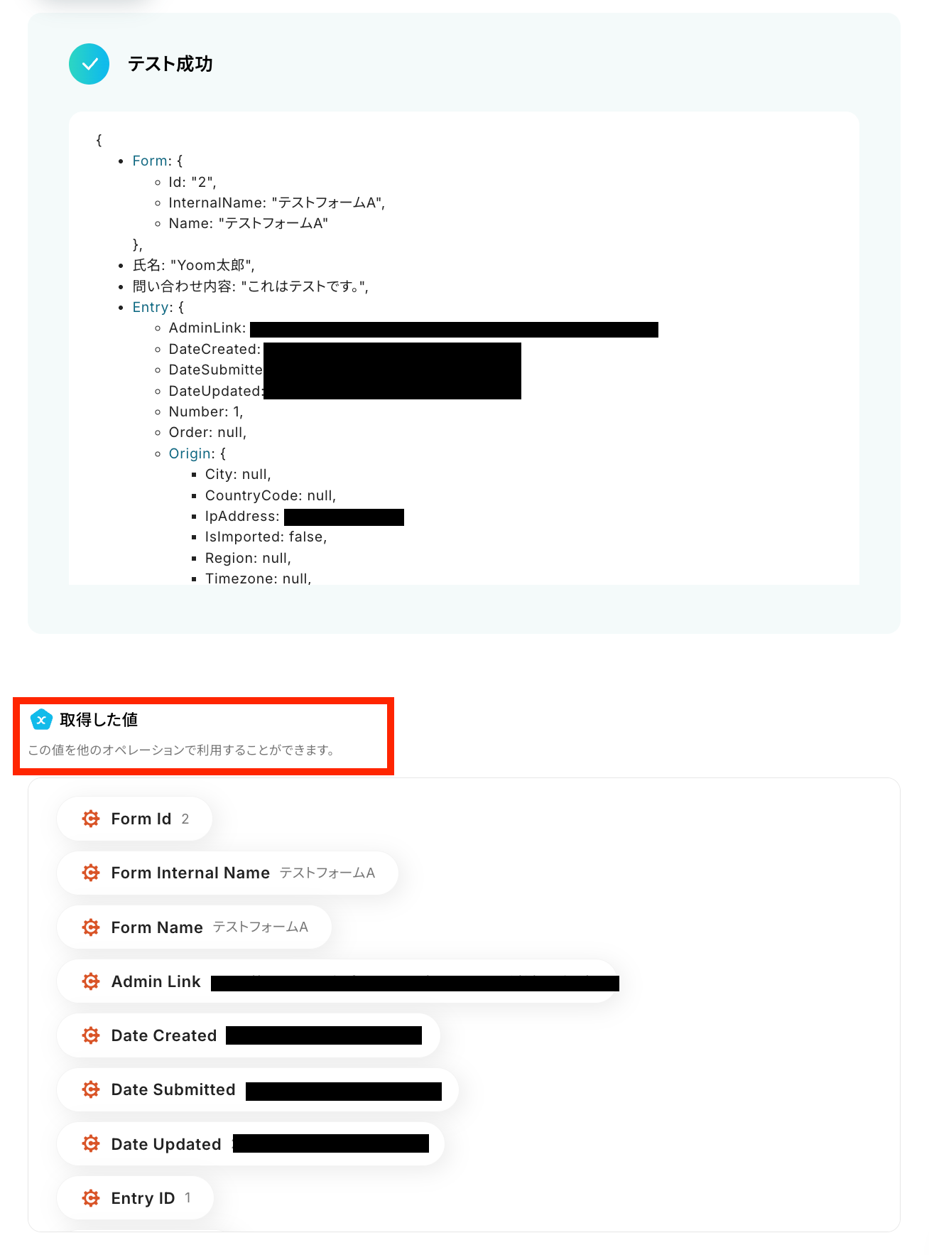 - Cognito FormsのアウトプットはJSONPathから取得可能です。取得方法は「『取得する値』を追加する方法」をご参照ください。