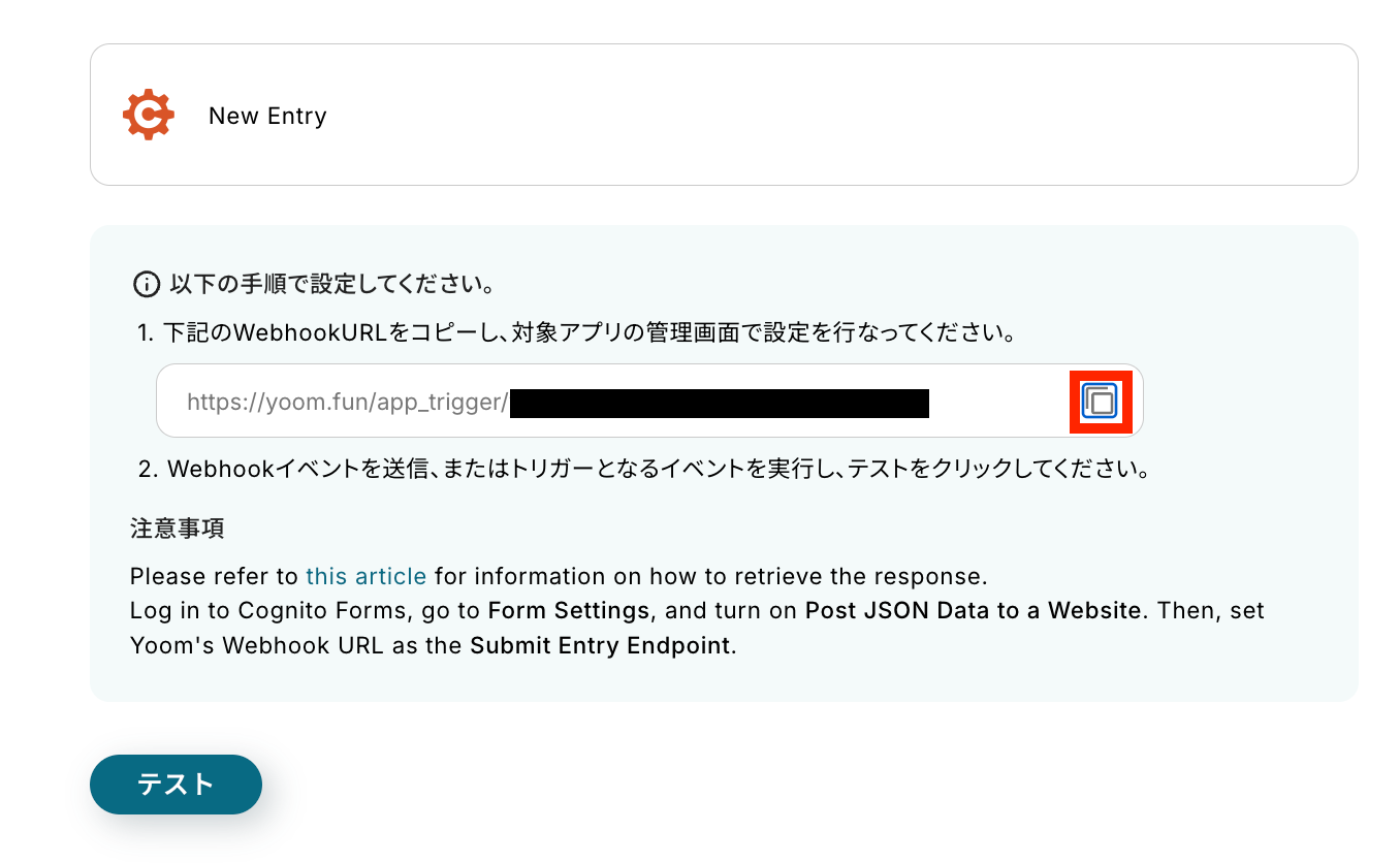 赤枠をクリックしてURLをコピーしたら、注意事項にしたがってCognito Forms上でWebhookを登録します。