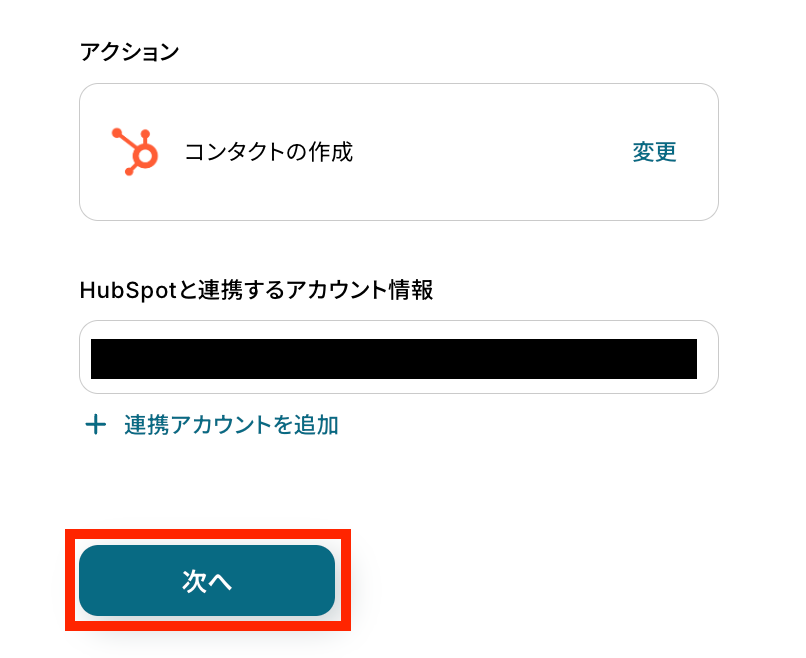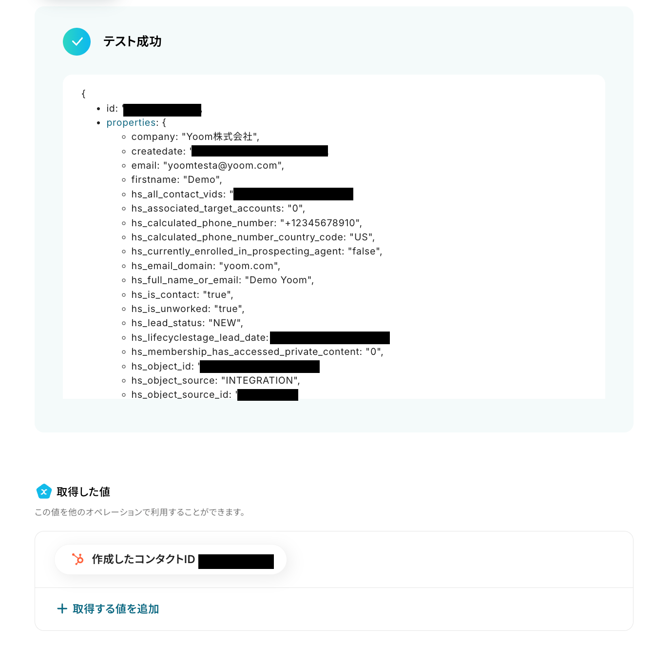 - HubSpotで「コンタクトの作成」アクションを設定する際に、登録したい情報を任意でマッピングできます。