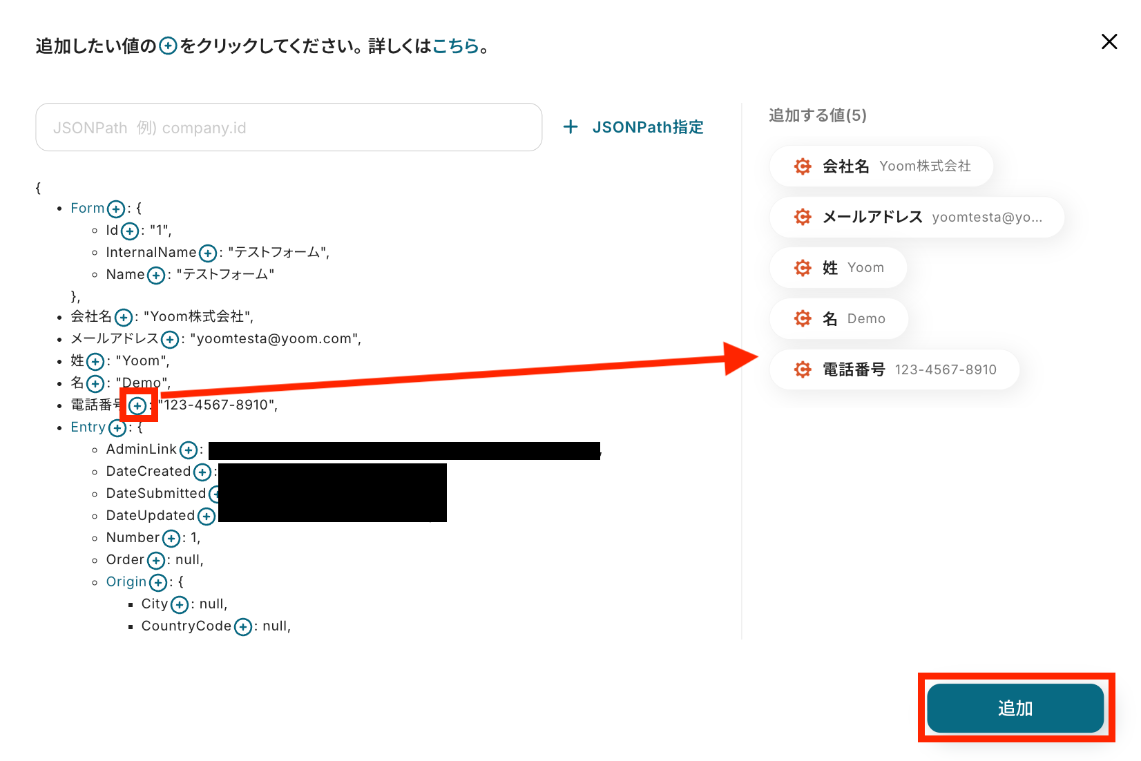 追加したい項目の右にあるプラスマークをクリックして追加する値を選択し、「追加」ボタンを押します。