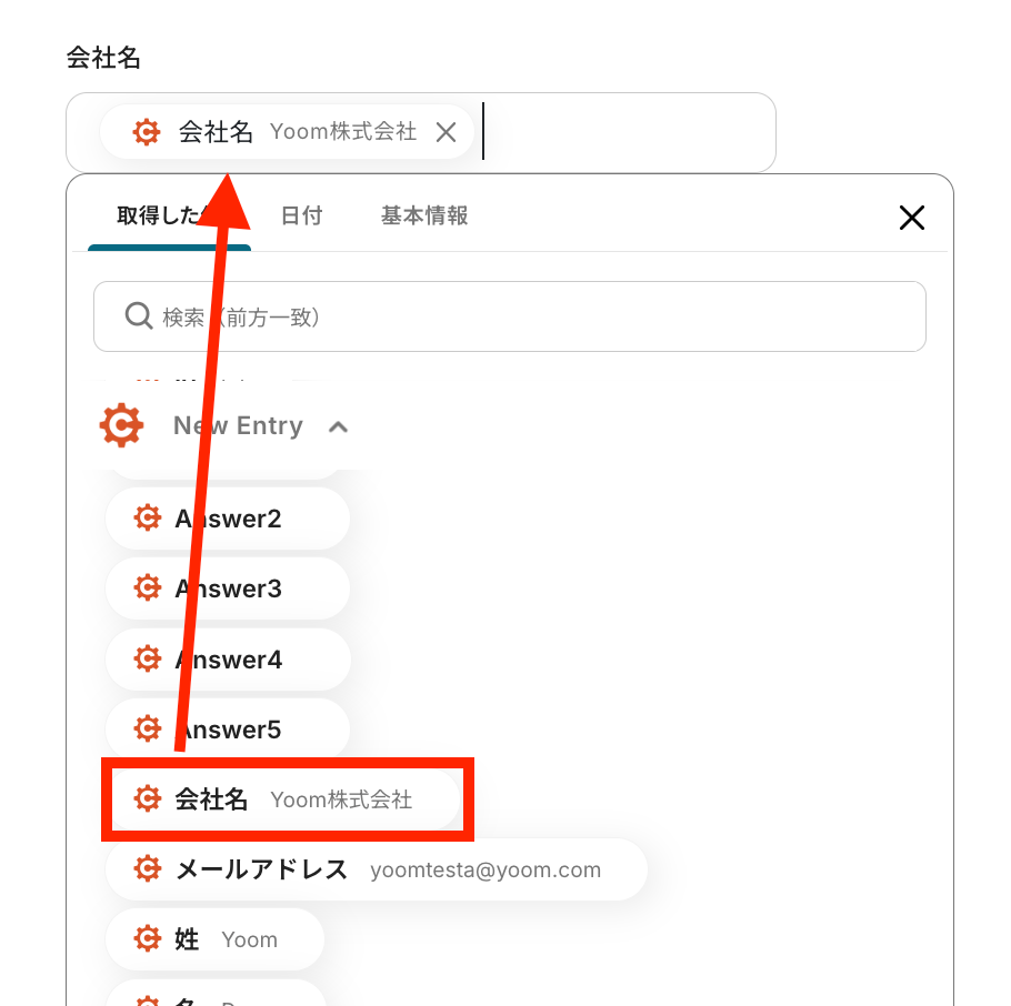 登録する会社名やメールアドレスを、下記のようにステップ3で取得した値の中から選択してください。