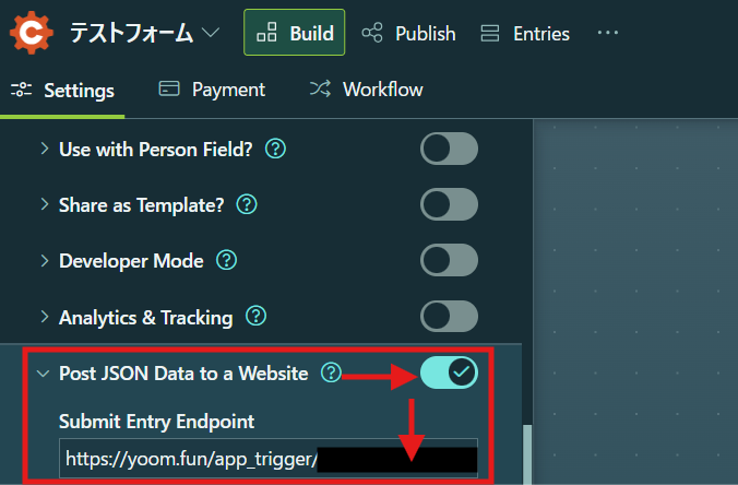 Post JSON Data to a Websiteのトグルをオンにして、Submit Entry EndpointにはYoomで取得したWebhookURLを登録しています。