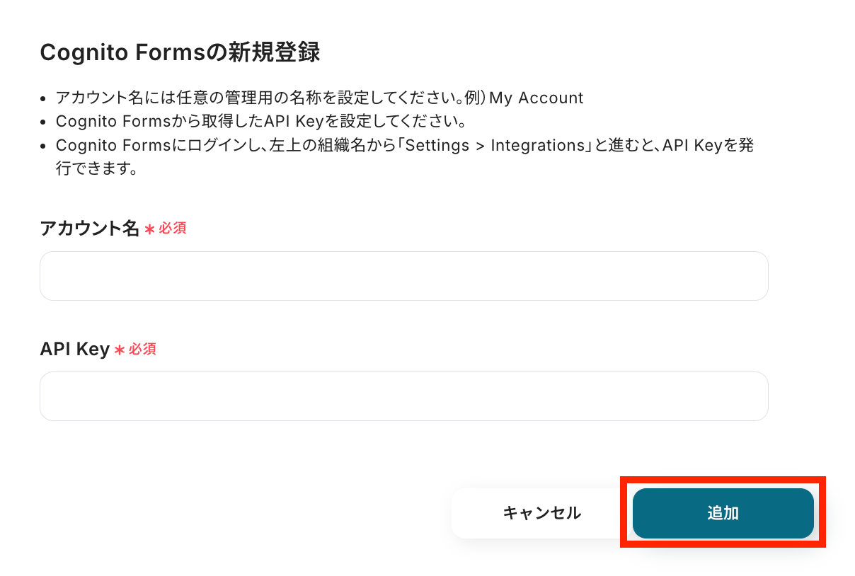 任意のアカウント名とAPI Keyを記入して、「追加」ボタンをクリックします。