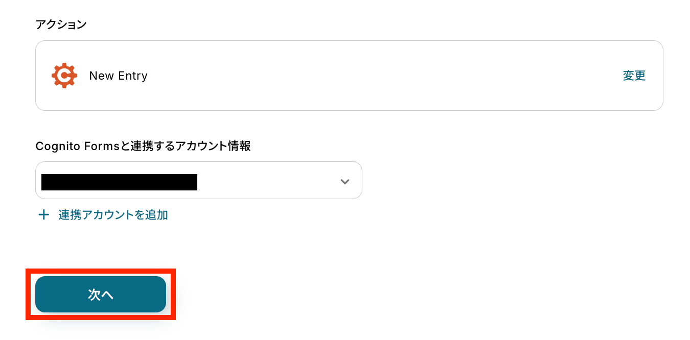 - 次に、トリガーでCognito Formsを選択し、「New Entry」アクションを設定します。