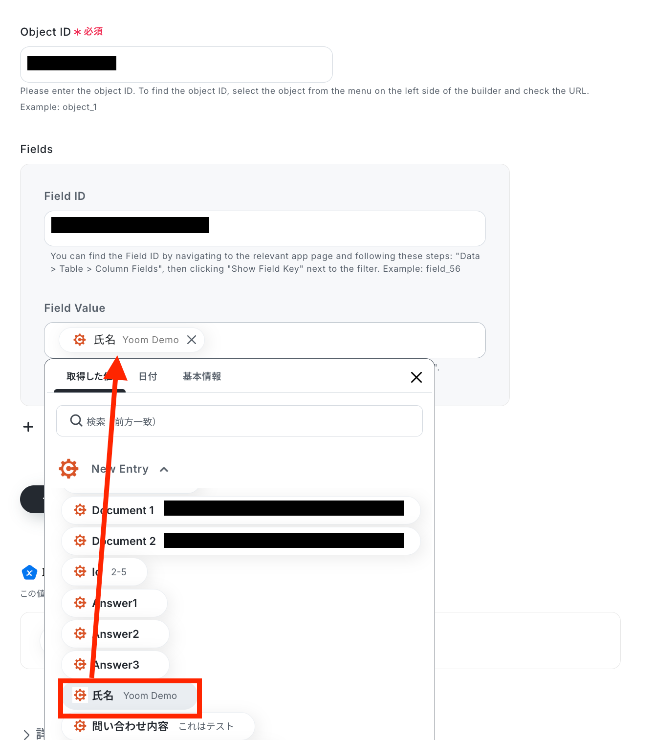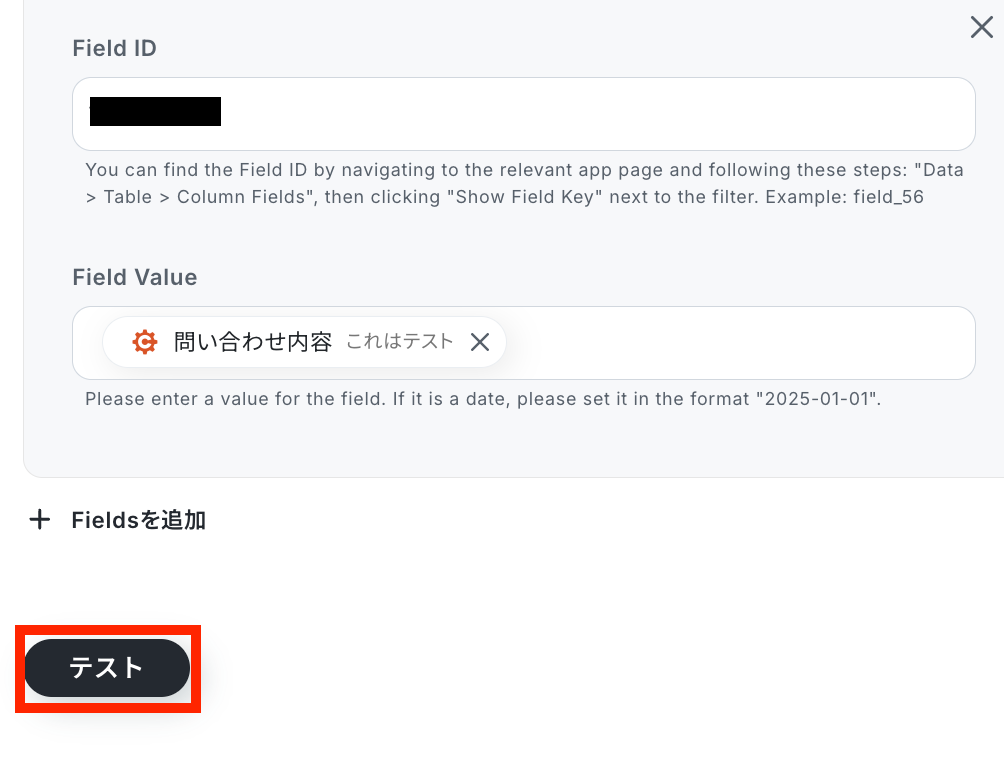 「Field Value」はステップ3で取得した値を選択して設定しましょう!